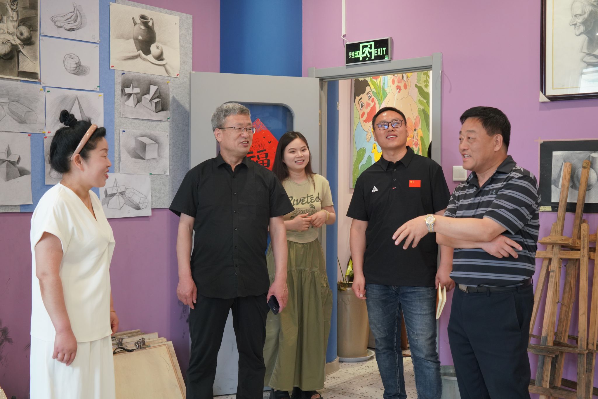 访企后,看望了2019届优秀毕业生慕宇,了解了近期发展情况,参观了家族企业画童少儿画室,根据介绍,慕宇自毕业后考上教师编制,帮助家人提升画室办学规模、制定企业目标、规范企业管理、创办品牌,成为当地知名少儿培训企业。孙驰对校友,敢闯敢干的精神给予肯定,并对画室的环境创设和办学规模给出高度评价,并热情邀请校友返校交流,为学弟学妹传经送宝,同时也希望慕宇能够坚守教育初心,做好本职工作的同时,多为社会做贡献,给母校争光。(图文:周振国,终审:范云峰)