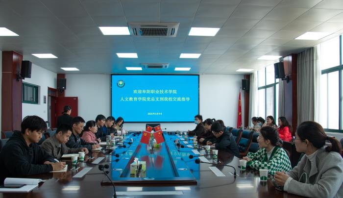 3月9日上午,阜阳职业技术学院党委书记张冲, 党委委员、组织人事部部长王明跃及人文学院、马克思主义学院支部负责人、党员教师到我校进行党建和思政教学工作交流。市人大常委会副主任、校党委书记金杰、党委副书记于华献、党委委员、纪委书记孙驰、党委委员、办公室(宣传部)主任(部长)徐常恺及马克思主义学院、小学教育学院负责人陪同考察交流。