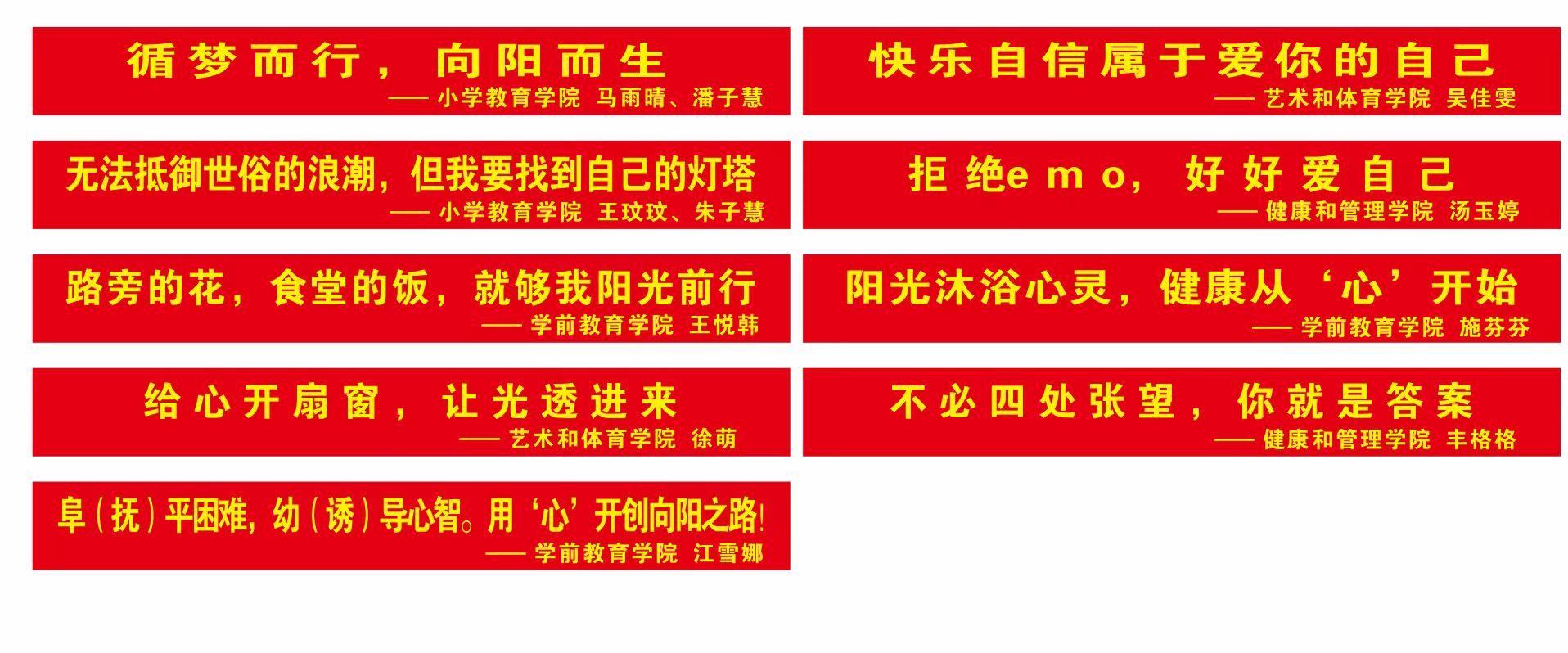 4月,小学教育学院举办了心理健康日宣传语征集活动,在各学院的广泛宣传与同学们的积极参与下,共100余名学生提交了作品,心理健康教育中心将部分优秀作品印制了条幅,在校园内进行了展示。