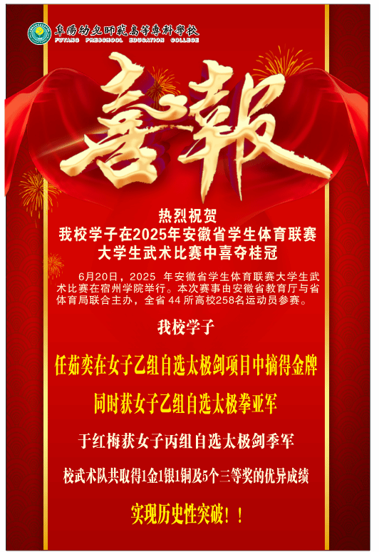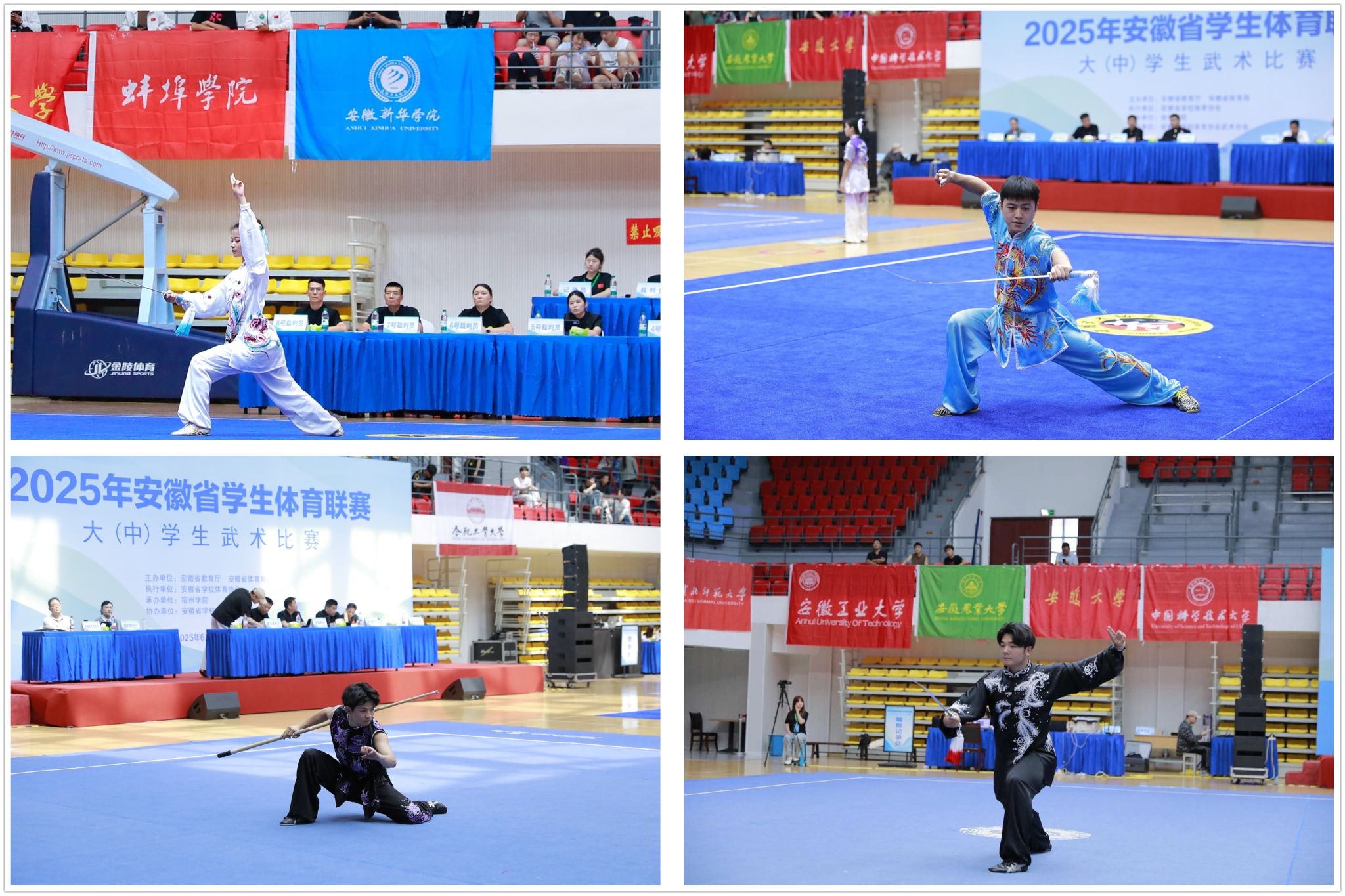 6 月 22 日,2025 年安徽省学生体育联赛大学生武术比赛在宿州学院落幕。本次赛事由安徽省教育厅与省体育局联合主办,全省 44 所高校 258 名运动员同场竞技。我校学子任茹奕在女子乙组自选太极剑项目中勇夺金牌,同时斩获女子乙组自选太极拳亚军;于红梅获女子丙组自选太极剑季军。校武术队队员们在枪术、南棍、太极拳等 7 个项目中表现亮眼,最终取得 1 金 1 银 1 铜及 5 个三等奖的优异成绩。